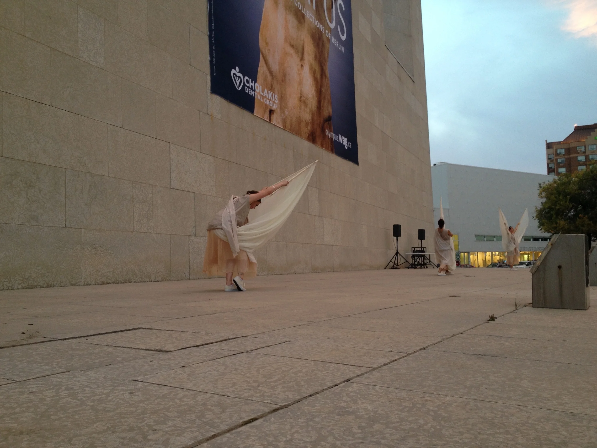 I started my night out around 7:30pm at the Winnipeg Art Gallery. The first thing I saw were some dancers in front of the gallery dressed in toga like attire. The dancing was done in silence and with the element of the wind, I'd have to say that the whole thing was quite beautiful.