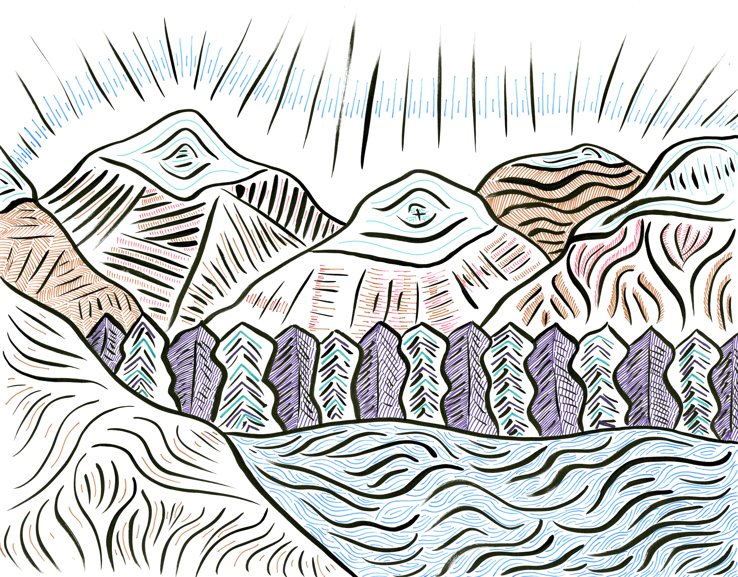 I started by using a paint brush and india ink to create an outline of mountains, a lake, and some trees. I visualized a scene from my camping trip last summer in BC. Next I added line details using coloured micron pens.