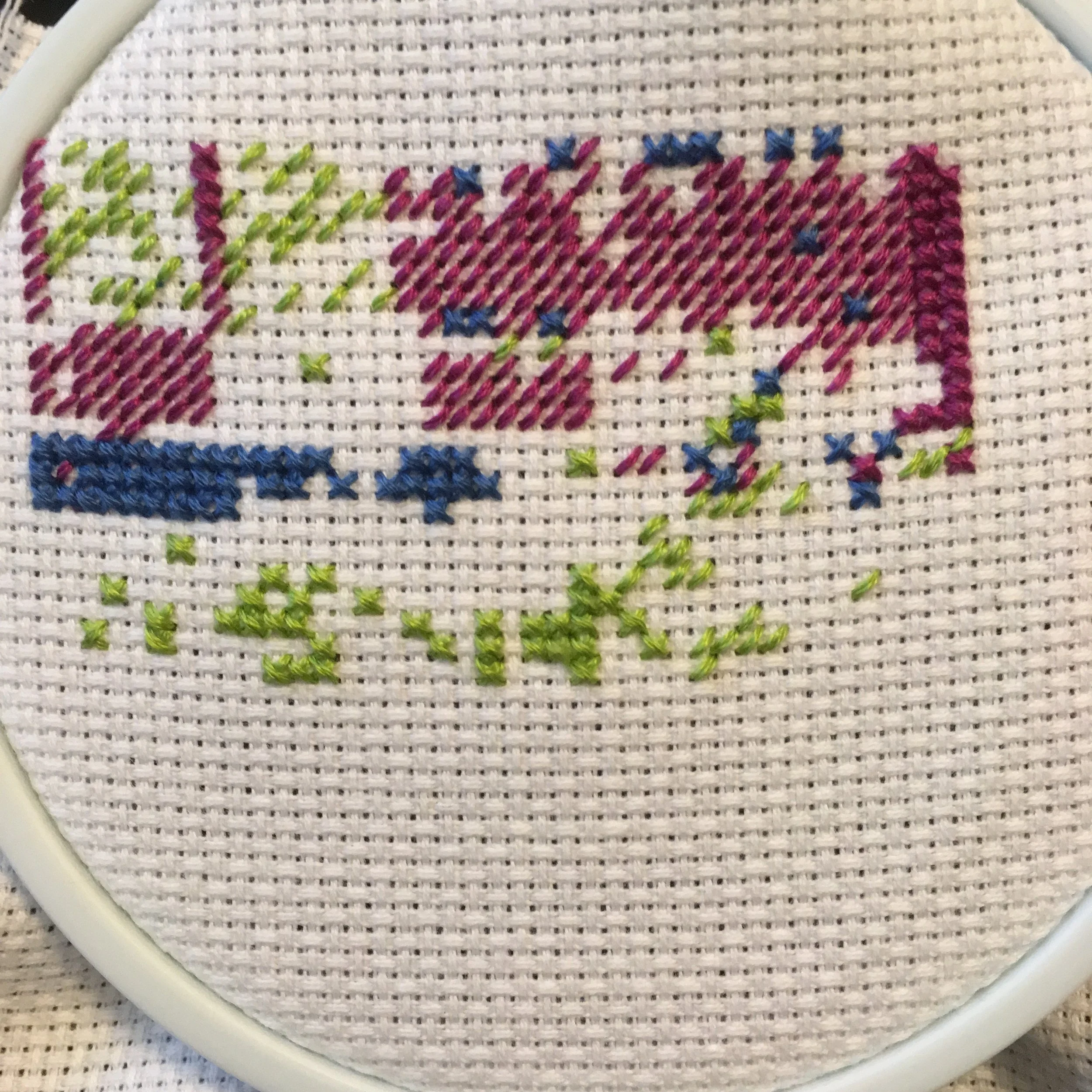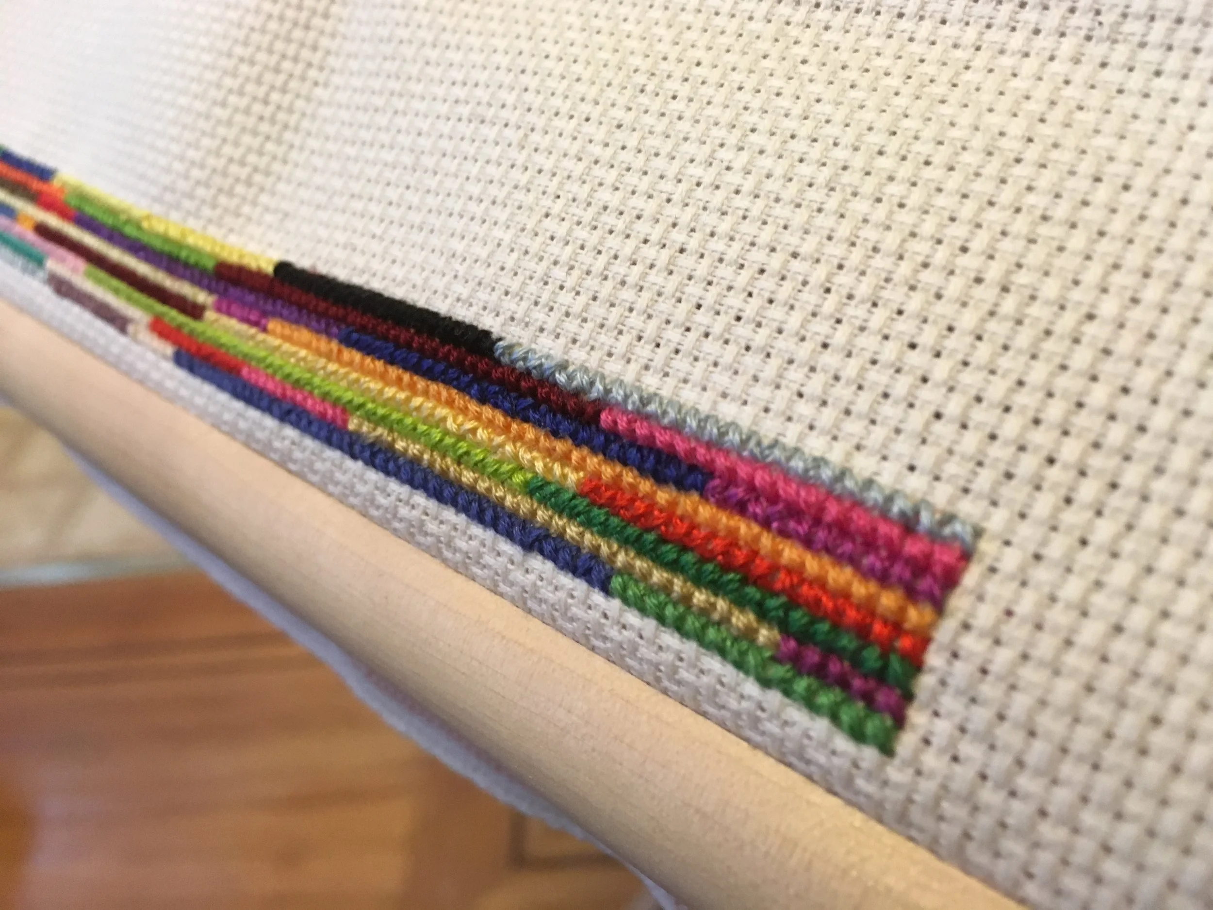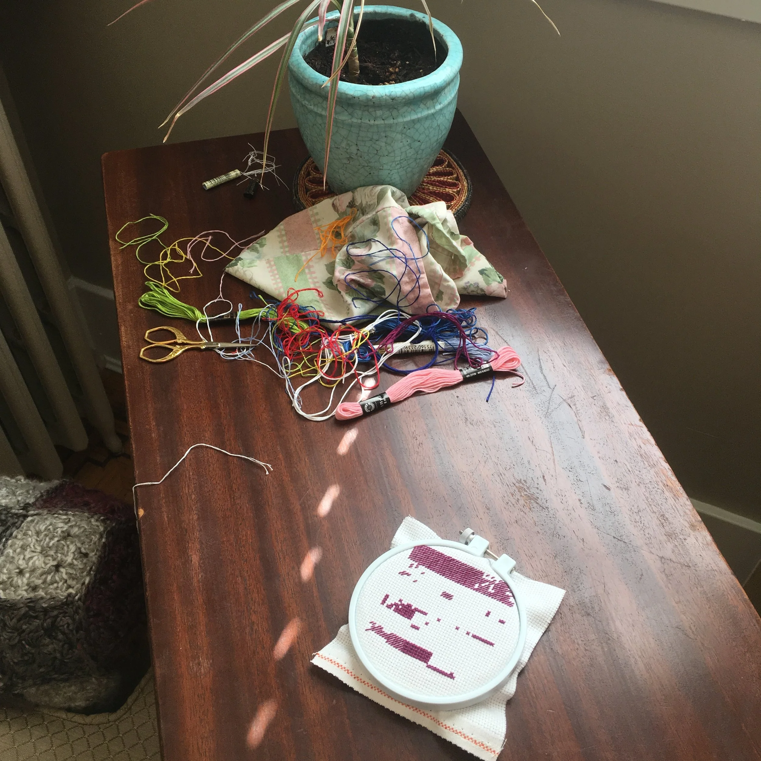 Stitching Loose Ends, work in progress (2018-2019), embroidery floss, Aida cloth