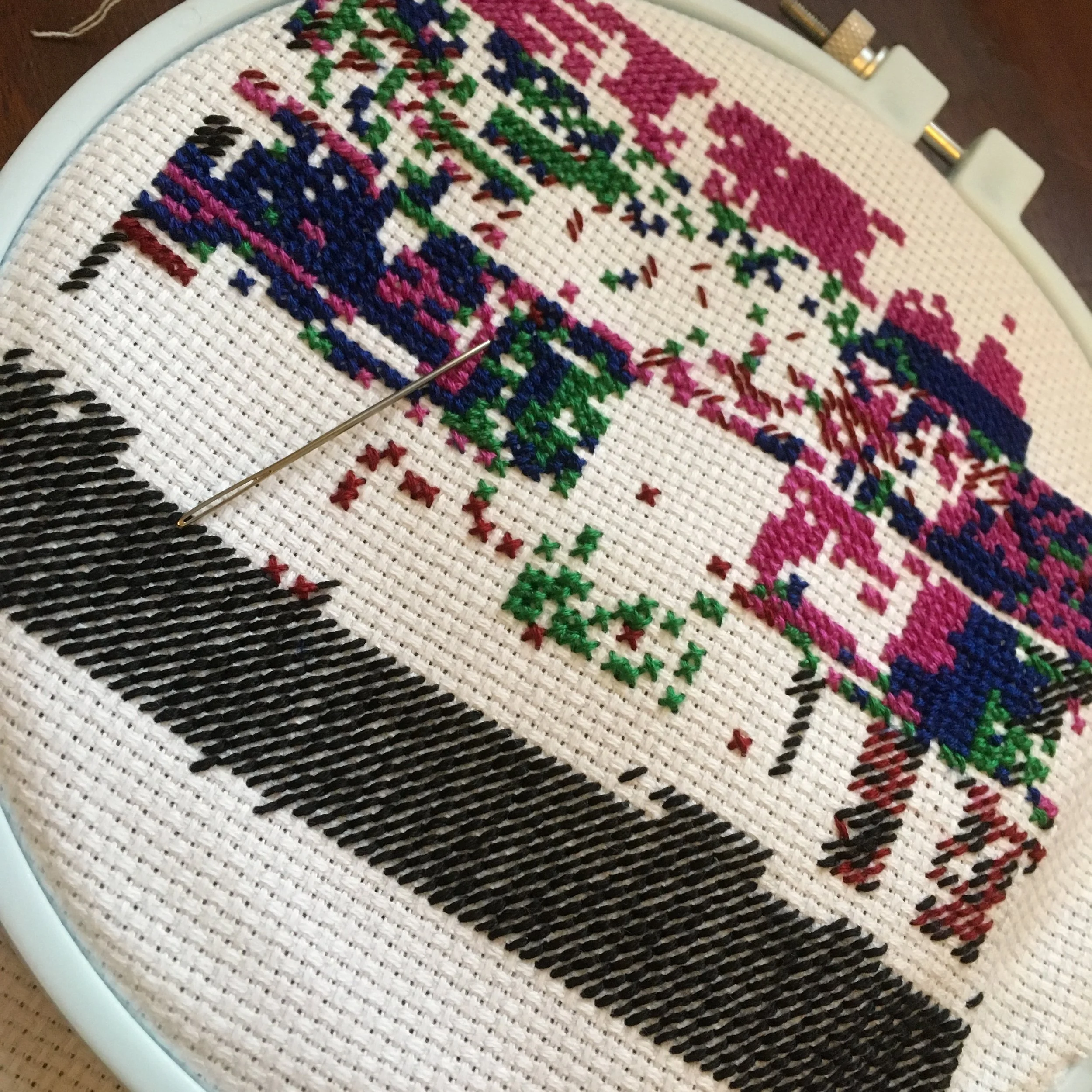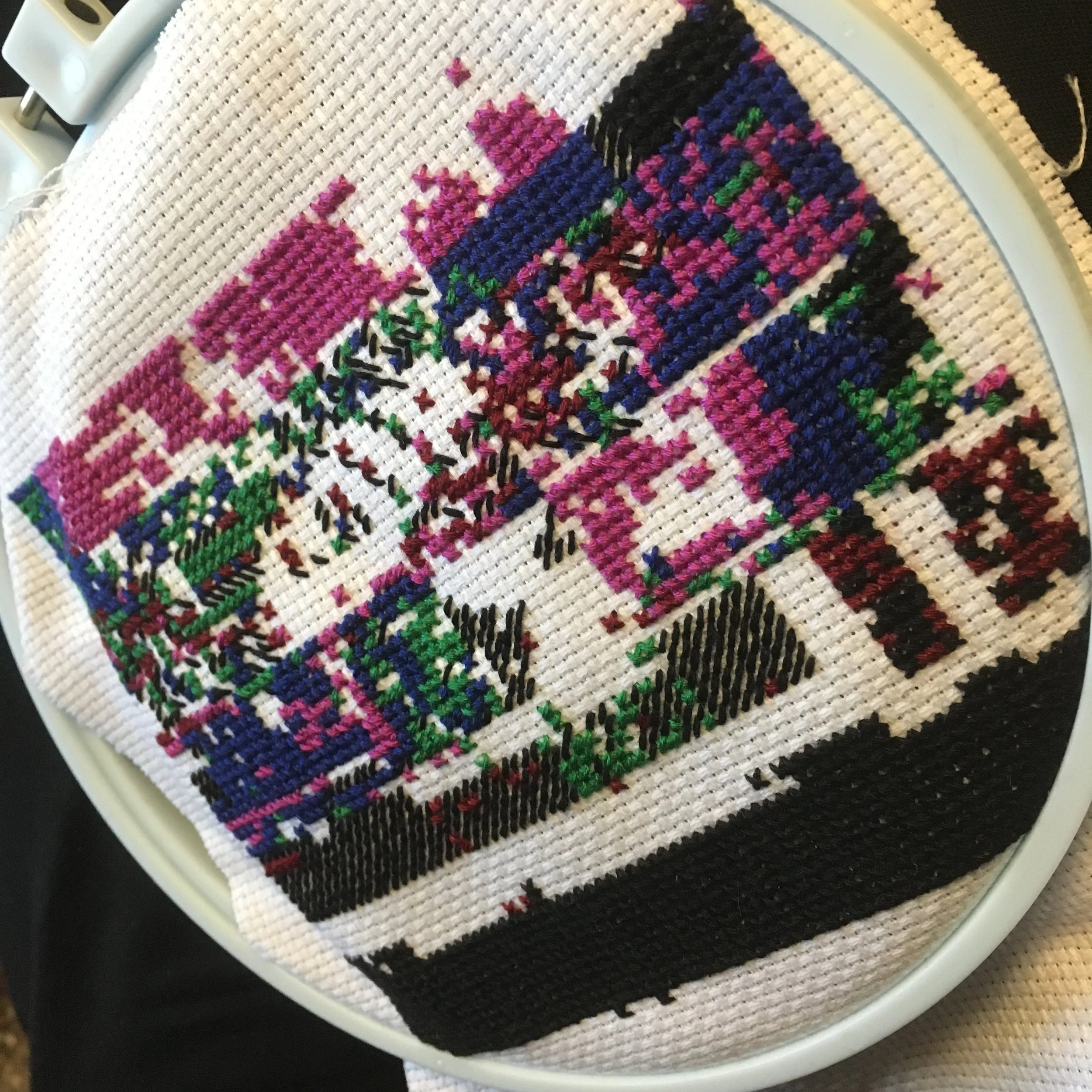 The past month has been jammed packed with many hours of cross-stitching, as I begun working on my project funded by the Canada Council for the Arts. First, I received my new embroidery stand and hoops in the mail. Second I fully prepped a piece of Aida cloth by securing the edge with stitches, to prevent fraying. I even marked the vertical and horizontal middles with stitches, which is something I rarely do!