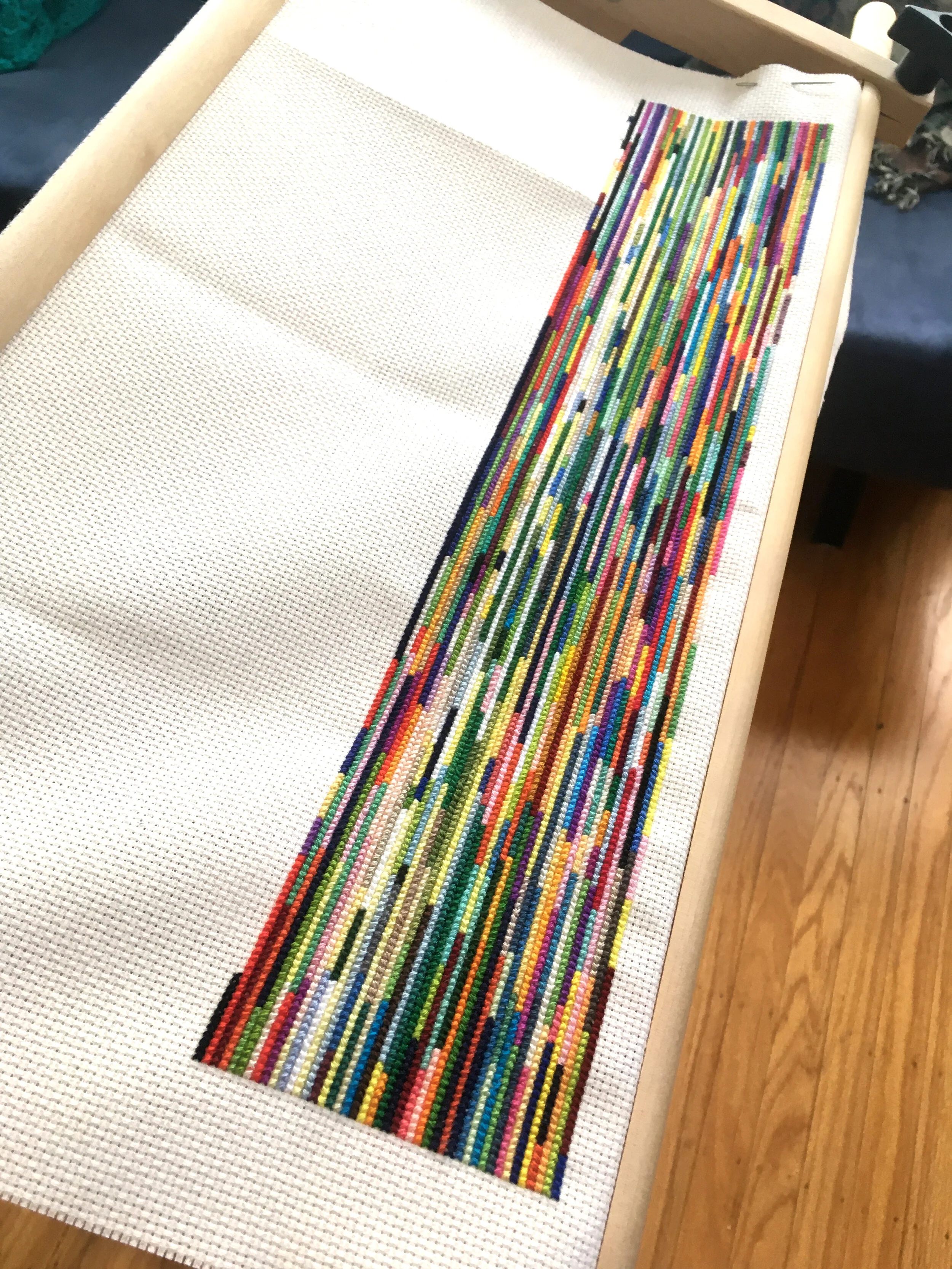 I’ve also been making consistent progress on this new large-scale cross-stitch piece, Glitch Streak. I’m currently 1/3 of the way complete and it’s about 10 inches wide. When the work is finished I expect it to measure 30 inches wide. I’ve already logged in about 65 hours of labour on this project! Needless to say the further I get on this piece, the more taxing and strenuous it is getting on my body. This is precisely why I’m pacing myself slowly on this project and spending time on others that are less laborious than this one!