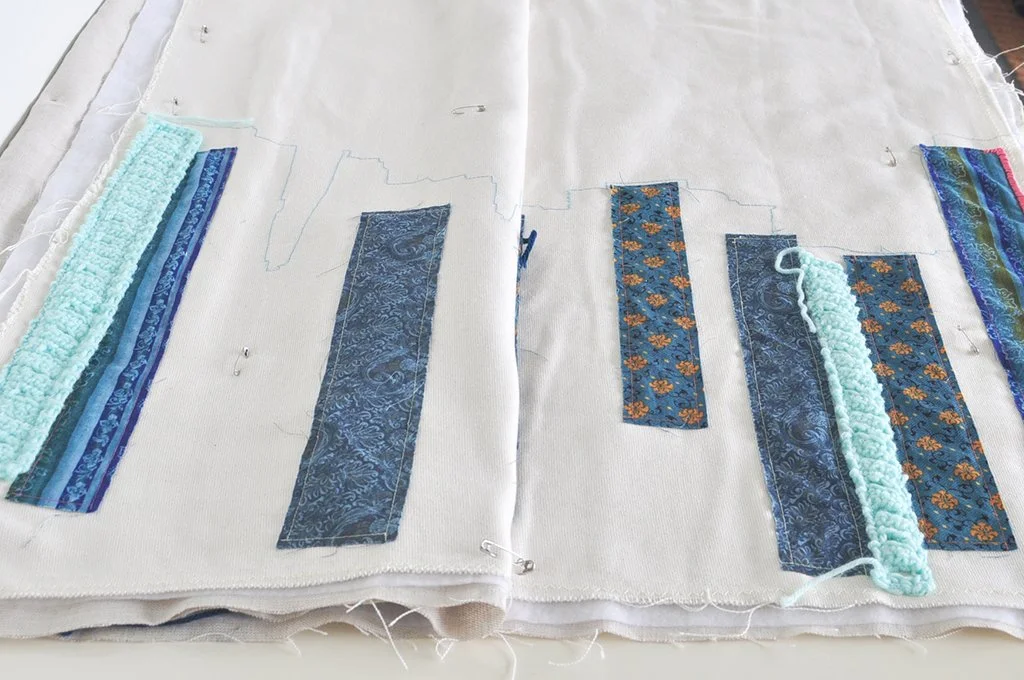 After pinning the strips, I went straight to the machine and sewed my fabric buildings onto the canvas. With the spaces in between I wanted to use a variety of fibre mediums and so I planned out the layout of the fibre buildings in my sketchbook. I headed to Michaels and purchased a few skeins of yarn which could be used for the project. Then I got started on crocheting building strips in two different shades of blue.
