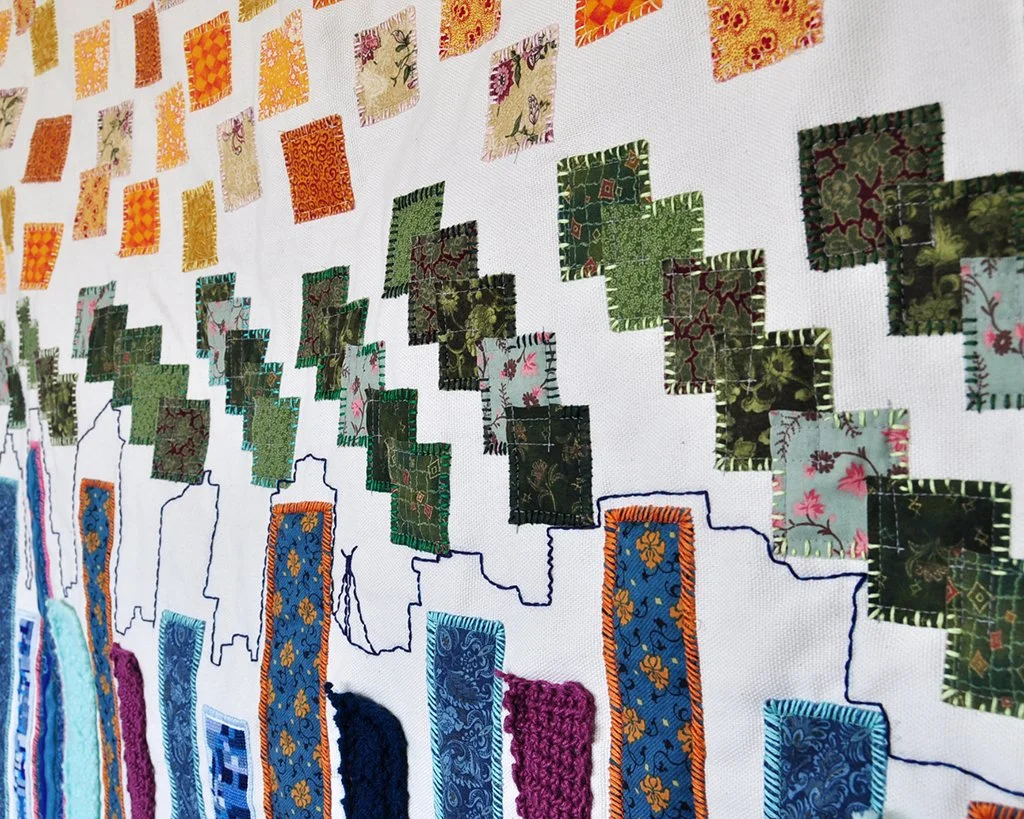 Vancouver Cityscape (Work in progress), 2022, mixed textiles, canvas, linen, cotton, yarn, thread⁠