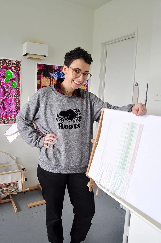 Mallory Donen with her work in progress Glitch Streak. Photo was taken in her studio in Vancouver, BC, 2022.