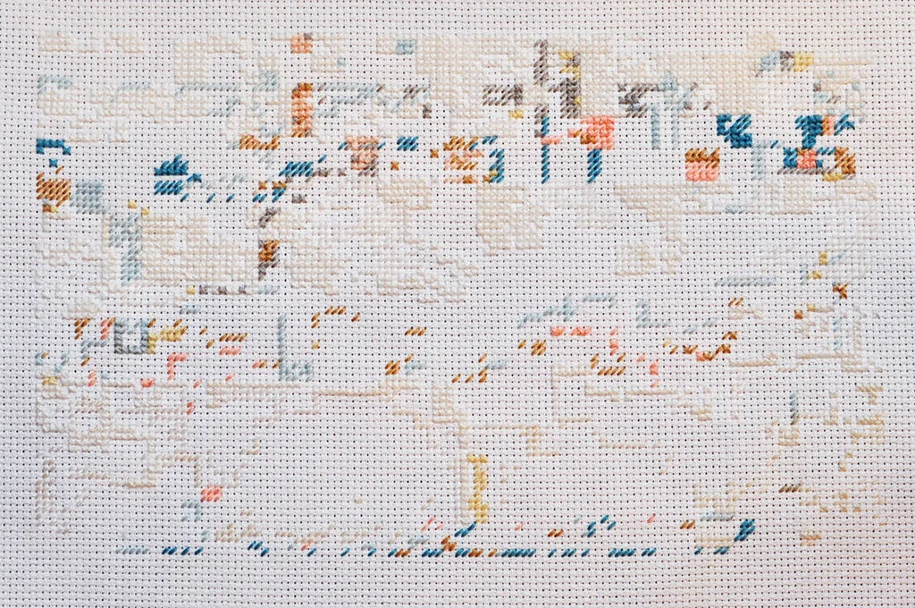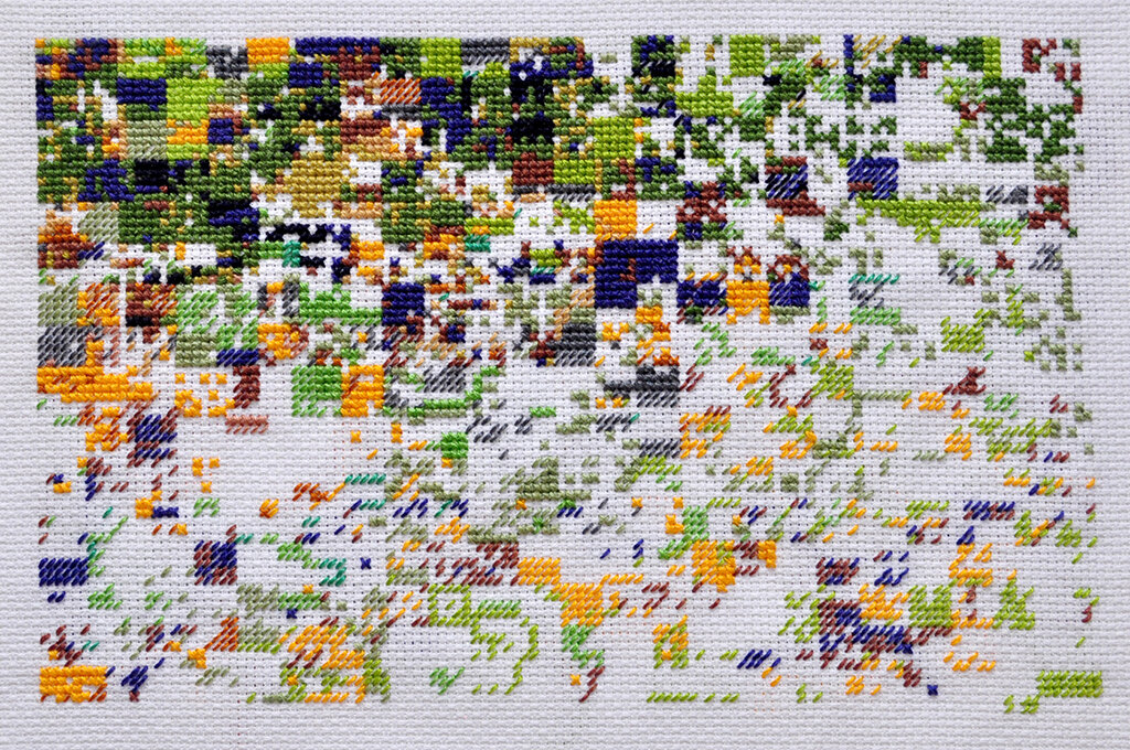 Throughout the process I intentionally left parts of the imagery unstitched. This choice was my way of introducing a manual malfunction, an error, a glitch. The result was a glitch within the original glitch image used. Through the motion of stitching and by following the cross-stitch pattern, I’ve re-created the source glitch. Then, I’ve purposefully disrupted the act of stitching in order to produce an error within the pattern in order to generate a new glitch image. By becoming the machine and embracing the error, I use it as a mode of creation and growth to discover new possibilities and outcomes.