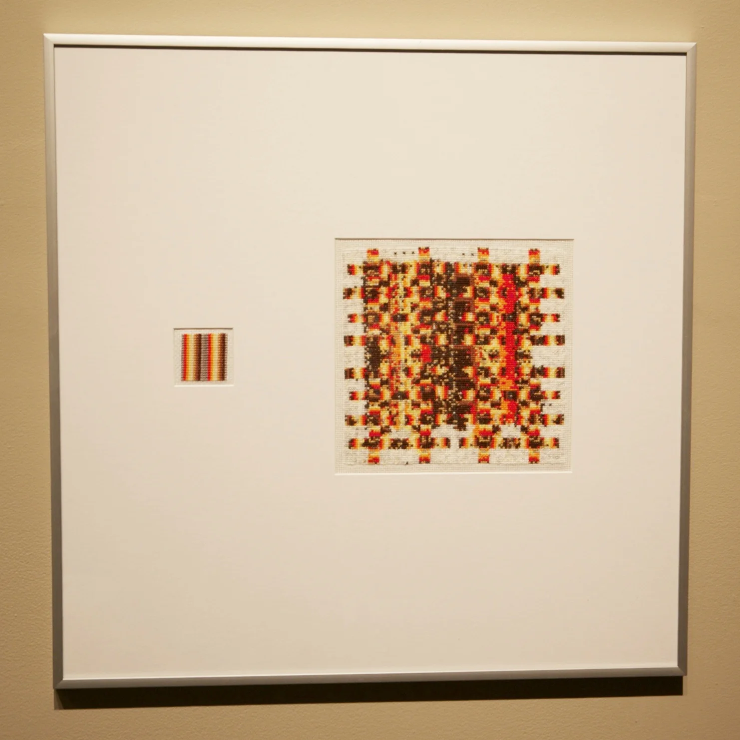 The series began by cross-stitching two small squares that were created entirely from my own mind. Therefore, I did not use a pre-established pattern to create the works, which is usually the case when cross-stitching is concerned. However, I did find myself making rules and instructions in my head while making each of the squares. Therefore, they still appear to be quite controlled and ordered. Next, the resulting cross-stitched squares were scanned digitally as Jpeg files onto a computer. The digital images were manipulated in Photoshop in order to create two new images more complex than the initial ones.